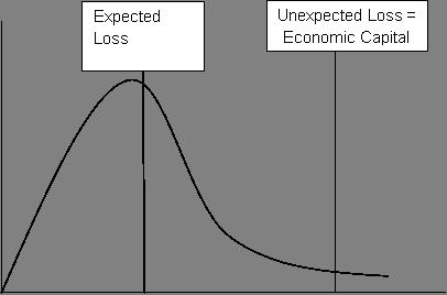 Economic capital is generally calculated using a VaR approach. That is, the loss at given level of probability, known as the confidence level. This is illustrated in the diagram below: