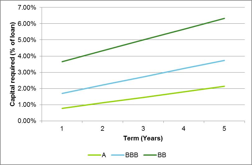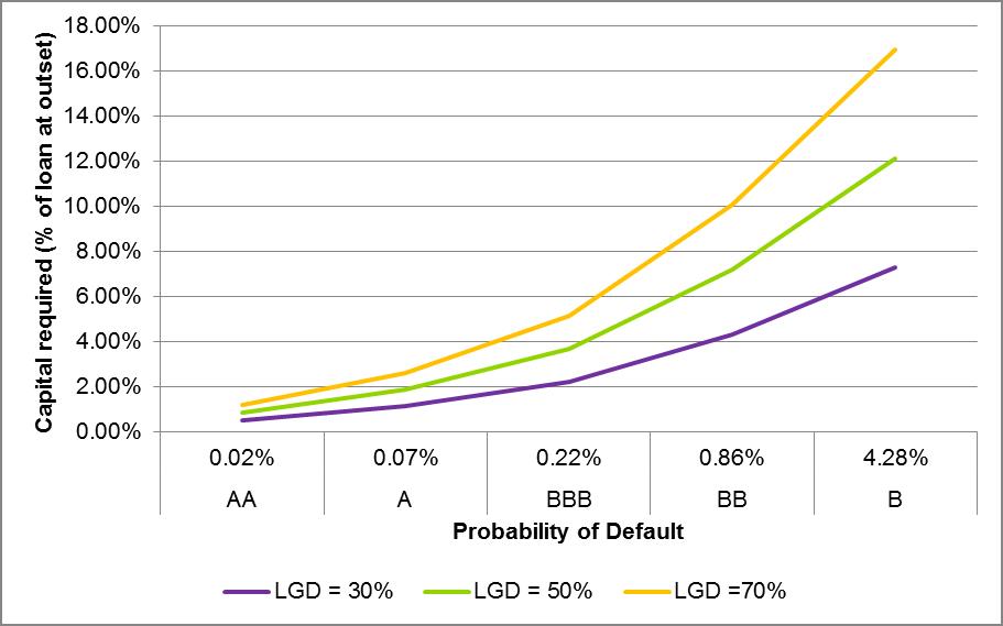 To get an idea of capital required, the table below shows capital held for different Standards and Poor’s ratings grades. To provide some context the Probability of Default (PD) is set equal to default rates observed by S&P for different credit grades from S&P’s 2013 default study. The chart shows capital expressed as a percentage of the loan amount at the outset by PD for three (Loss Given Default) LGD estimates: