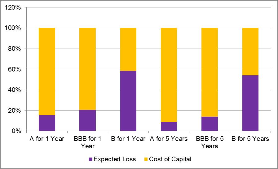 - An interesting observation is the relative contribution of the expected loss and the cost of capital to the spread. For highly rated securities, the expected loss is a minor part. However for lower rated securities, this dominates. The credit portfolio model that determines capital allocation becomes more important for highly rated securities relative to the expected cost (driven by PD and LGD). The graph below shows the relative contribution. For highly rated securities in this example the correlation to the systemic risk factor becomes a more important driver.