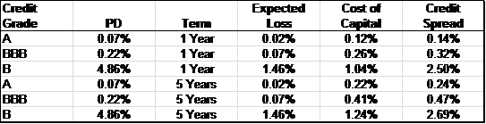 The table below builds up the spread required for different credit grades. I have not added an expense margin. The expense margin will vary depending on the size of the loan, cost structure of the bank or the division selling the loan and perhaps the sales channel.